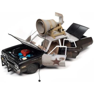 Brand new 1/18 scale diecast car model of 1974 Dodge Monaco “Bluesmobile” with Loud Speaker Black and White (Dirty) with Jake and Elwood Blues Figures “The Blues Brothers” (1980) Movie die cast model car by Auto World.Limited edition.Brand new box.Real rubber tires.True-to-scale detail.Has steerable wheels.Officially licensed product.Has opening hood, four doors and trunk.Manufacturer’s original unopened packaging.Made of diecast metal with some plastic parts.Detailed interior, exterior, engine compartment.Figure dimensions approximately 3.75-4 inches tall.Dimensions approximately L-12, W-4.25, H-6 inches.Prominently featured in the 1980 Universal Pictures film The Blues Brothers, this 1974 Dodge Monaco was a decommissioned Mount Prospect police car, purchased by Elwood Blues at an auction after he traded a previous car (a 1968 Cadillac Sixty Special) for a microphone. When describing the car to his brother Jake Blues, Elwood says, “It’s got a cop motor, a 440-cubic-inch plant. It’s got cop tires, cop suspension, cop shocks. It’s a model made before catalytic converters so it’ll run good on regular gas.” The sedan has the ability to perform seemingly impossible stunts, such as flipping backwards in midair and even “flying” for very brief periods of time. Clearly unimpressed, especially considering the cigarette lighter does not work, Elwood slams on the gas and jumps over an open drawbridge. Jake nonchalantly states, “Car’s got a lot of pickup.” Elwood retorts, “So what do you say, is it the new Bluesmobile or what?” Jake replies, “Fix the cigarette lighter.”Auto World proudly presents a detailed replica of the Bluesmobile with the loud speaker mounted on the roof that Jake and Elwood broad-casted their upcoming “Blues Extravaganza” fund raising concert. True-to-life figures of The Blues Brothers, Elwood and Jake, are included.
