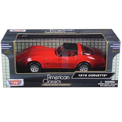 Brand new 1/24 scale diecast car model of 1979 Chevrolet Corvette Red with Black Top die cast model car by Motormax.Brand new box.Real rubber tires.Opening hood and doors.Officially licensed product.Made of diecast with some plastic parts.Manufacturer’s original unopened packaging.Detailed interior, exterior, engine compartment.Dimensions approximately L-7.5, W-3, H-2.5 inches.Please note that manufacturer may change packing box at anytime. Product will stay exactly the same.
