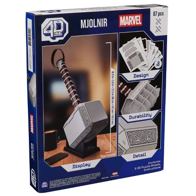 This 4D Build Thor Mjolnir Hammer is beckoning to be displayed on your shelf! Embark on a superhero adventure with our 3D puzzles from Marvel Studios: The Infinity Saga. This 4D Build Mjolnir toy includes a stand for when it’s complete! You get 8 sheets with 87 detailed punch-out pieces and easy-assembly instructions. No puzzle glue or tools required! It measures 18.9 in x 5.6 in 21.5 in (48 cm x 14.1 cm x 54.5 cm). Perfect for your home- bedroom decor, game room decor, or with your Avengers toys- display your model kit with pride. For new young fans of the Avengers- this puzzle makes the perfect present for any teen superfan. And for the old fans of the original superhero toys, it is the perfect adult toy, as well. 4D Build makes fantastic birthday gifts for men and gifts for him! Also hobbies for adults, model building kits, and 3d puzzles for kids, and models for adults to build. Whether you love the Black Panther, Iron Man helmet, Groot or Spiderman toys– this 4D Build puzzle is for you. Check out our other toy building sets for more Avengers & Spider Man toys for ages 14 and up. Get out your Iron Man action figure & more Thor toys for some Marvel fun and start building! Includes 8 3D Puzzle Sheets, Instructions