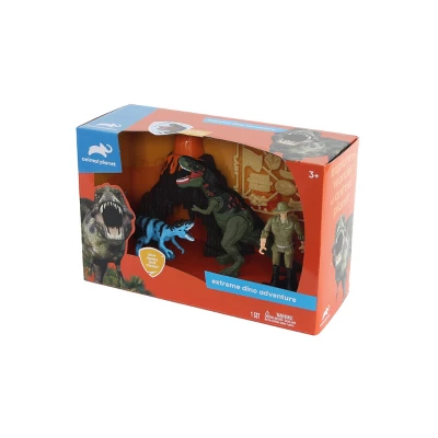 Animal Planet brings the animal kingdom to life. Let your instincts take over and your imagination go wild. Travel back in time to when mighty dinosaurs roamed the planet! Beware the dinosaurs as the larger dino features real chomping action. This set includes 1 figure, 1 cave, 2 dinos, and 8 accessories. Ages 3 and Up.