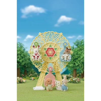 Baby Ferris Wheel includes a cute ferris wheel that can seat up to 3 babies and a Toy Poodle Baby figure.Baby Ferris Wheel’s ferris wheel can be turned by holding onto the handle and turning to spin the circular base.Can be placed on top of Baby Castle Nursery (sold separately). Have even more fun playing alongside Baby Airplane Ride (sold separately).Frame (Left), Frame (Right), Gondola x3, Pole, Center Piece, Lock Piece, Handle, Base (Left), Base (Right), Toy Poodle Baby (a total of 12 pieces)