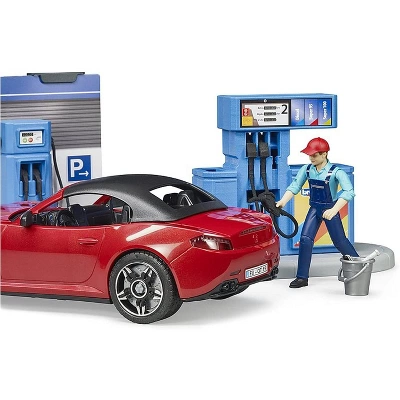 - Includes Bruder Roadster with driver; Fuel pump and charging station for electric cars