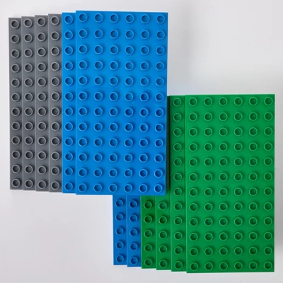 - INCLUDED IN THE SET: This set includes a 12-piece set of stackable baseplates in blue, gray & green, measuring 7.5 x 3.75 inches each. For maximum building space, these bases have 6 x 12 large big dot pegs. These baseplates are versatile and can be used to create building tables or mats, or simply laid out over the floor for playtime. With its durable construction, you can be sure that this base plate will stand up to hours of building and imaginative play.