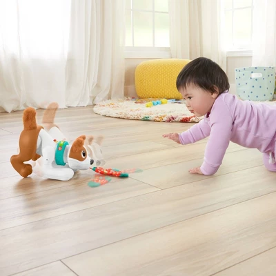 - Pretend electronic dog with soft ears, tail, and realistic motions to help get baby crawling