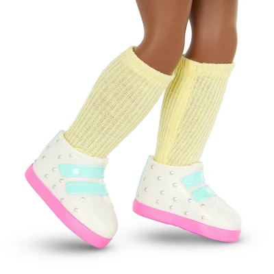Playtime sure is sweet with Sweet Sprinkles, the 14-inch doll outfit from Glitter Girls! From its cotton candy colors to its donut print, this set of doll clothes is enough to make your favorite doll’s mouth water. The pink sweater is super cute with its sprinkled donut embroidery, and the skirt shimmers in shades of pastel pink and blue. Also included is a yellow pair of socks to add a pop of color, plus a hair tie dotted with a colorful sprinkle print. Don’t forget the sneakers – the shoes in this outfit slip right on to your 14-inch dolls, and each piece is easy to change for seamless playtime. Finish the look with pink, round sunglasses and glittery fanny pack with turquoise waistband. Sweet style! Glitter Girls doll clothes and accessories are compatible with most 14-inch dolls. Recommended for kids ages 3 years old and up.