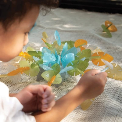 Build with soft colors of nature, creating organic patterns with friction-fit leaf shapes. Explore symmetry, develop fine motor and spatial skills. Construction activities can be enhanced through light table exploration. A beautiful, subdued, natural color palette and recyled material construction further enhance a child’s connection to the natural world. Set includes 10 double-sided activity cards and 96 colorful, interlocking pieces.