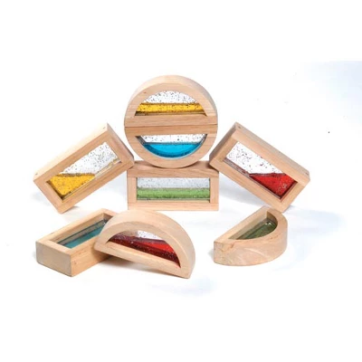 These wood-framed blocks add a new look to block play. Each set includes 4 square blocks and 4 half circle blocks. The colored water inside the blocks helps children learn about water as it’s shape changes with the movement of blocks. Looking through these blocks children get another perspective of the environment. These blocks work well on light tables. Square blocks measure 4 1/2″ across x 1 1/4″D. Half circles are 5 1/2″W x 2 3/4″H x 1 1/4″D.