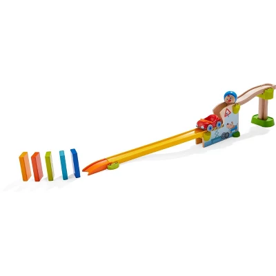 - Awesome play effect with 2 exciting functions: balls hop jauntily into the convertible or use it without the vehicle as a ski jump. 15 piece set includes: 1 jump into car effect with friendly illustrations, 1 wooden ramp, 1 starting block, 1 plastic curved ramp, 1 exit ramp, 1 column, 1 dark green base piece, 1 light green connector, 1 light green floor connector, 1 red ball-convertible, 1 ball Bert Boomer and 5 domino blocks.
