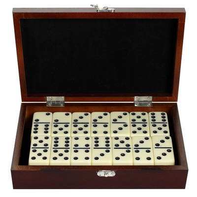 This Premium Domino Set is crafted from superior quality materials and produced under the highest level of manufacturing standards. The set includes 28, double-six, ABS standard, ivory-toned domino tiles with black pips/dots. The attractive, all wood, felt-lined storage case with brushed nickel latch makes this set perfect for travel or to put on display. Game rules included. 90-day limited warranty.