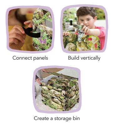 No need to rearrange the dining room chairs and raid the linen closet for sheets and blankets—just clear a space and build your very own fort with our exclusive 16 Panel Mossy Fortress Fantasy Forts Kit! 16 colorful heavy-duty cardboard panels with a fairytale ivy and moss stone castle print can be arranged and rearranged to build the fort of your dreams. Royal arched windows on 4 panels allow you to keep an eye on your surroundings, and let air flow freely while hanging out in your homemade fort. Want to change up the design? No problem! Innovative, double-sided hook and loop tape is easy to fasten and unfasten, allowing you to endlessly rebuild your fort. Plus, use the carton-building clips to support second stories. Collect multiple sets to build even bigger forts! Get ready to “fortify” your engineering skills and show off your creativity by building, pretending and dreaming inside your very own fort! For indoor use only.