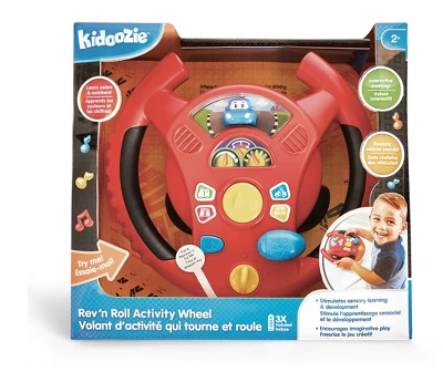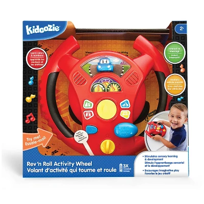 The Rev N Roll Activity Wheel from Kidoozie is an interactive activity toy that simulates steering and features buttons, horn and gear with realistic vehicle sounds! Suitable for tabletop or handheld play with interactive steering that simulates driving. Rotate the wheel and watch the toy car steer side to side with you! Press the buttons to learn colors and numbers with bilingual English and French learning modes. Buttons depict four unique vehicles with corresponding sounds and sirens. Stimulates sensory learning and development for children ages 2+. Requires 3 “AAA” batteries, included.