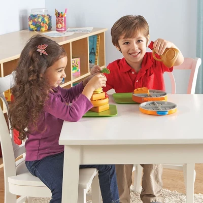 Kids develop imaginative play and social skills by engaging with others. Includes enough pieces to share with a friend: 4-piece waffle, syrup bottle, 2 strawberries, 2 pads of butter, 2 plates, and 2 forks. All 14 pieces are made of durable, soft plastic.