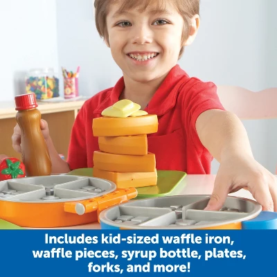 - 14 PIECES OF KITCHEN TOOLS & PLAY FOOD: 14 pieces include – waffle iron, 4-piece waffle, syrup bottle, strawberries, butter, 2 plates, and 2 forks