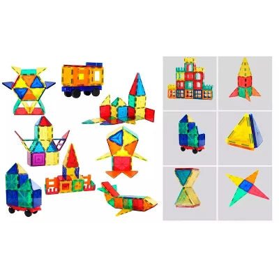Building Blocks develop kids’ creativity. Children can acquire a strong sense of color, geometrical shapes including 3D forms, number counts, magnetic polarities & architectural design at an early age. Magnet building tiles are easy to construct and easy to put away for storage. Fully compatible with other brands. Magnetic tiles inspire children’s manipulative ability, imagination, creativity, problem-solving, social skills, motor skills.