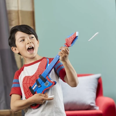 - SPIDER-PUNK WEB BLAST GUITAR: Kids can imagine they’re rocking out with this electronic guitar toy and protecting their neighborhood with web projectile-blasting action and over 25 sounds