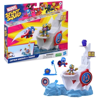 - CAPTAIN AMERICA VS. THANOS: Kids ages 4 and up can imagine the ultimate showdown between Captain America and Thanos with this Marvel Stunt Squad Tower Smash Playset