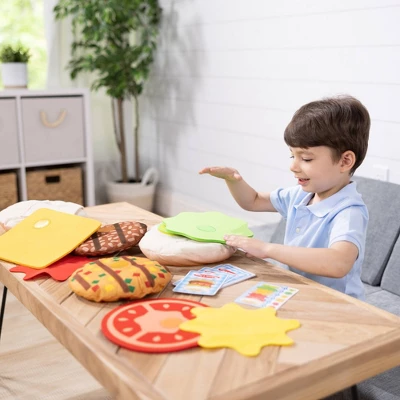 There are lots of ways to play with this super-sized burger! Match pictures on playing cards by stacking stuffed and felt ingredients between two puffy burger bun gloves with self-stick tabs. Or, play with a friend and wear the big bun gloves and play catch, have a burger-stacking race, and more! Fun, oversized ingredients include a burger, veggie burger, flat lettuce, tomato, pickles, and splats of ketchup and mustard. The set includes illustrated instructions for four games appropriate for both younger (4+) and older (6+) kids. Plus, kids will love counting, sorting, stacking, and making up their own ways to play with the jumbo food pieces!