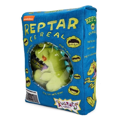 - 10” plush Reptar Cereal box, featuring Rugrat Tommy Pickles’ favorite world-saving (and sometimes ice-skating) dinosaur.