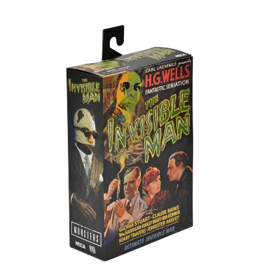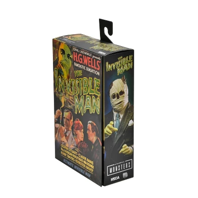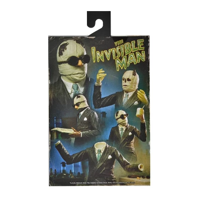 For the 90th anniversary of Universal’s sci-fi horror film classic, NECA is excited to reveal The Invisible Man in Ultimate action figure form! Starring Claude Rains, 1933’s The Invisible Man was based on the classic H.G. Wells novel and received critical acclaim, eventually being placed on the U.S. National Film Registry for its historical significance. The interchangeable heads capture the seemingly solid wrapped version as well as partially uncovered versions with peeks at the insane emptiness within. Also included are interchangeable wrapped and gloved hands, goggles, nose, notebook, wig, and cup with straw. The figure stands in 7” scale and comes in display-friendly window box packaging with opening front flap.