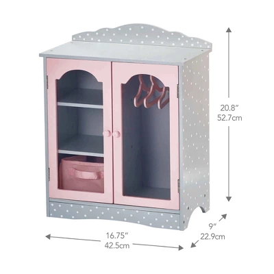 - Built with double doors and 1 drawer; 3 pink hangers included. Doll not included.