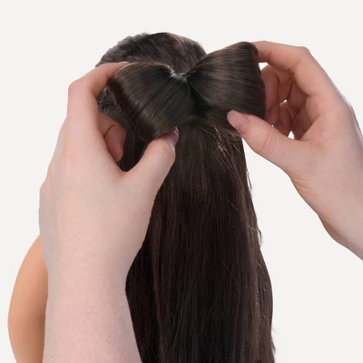 - Ultra-long, straight brown hair with center part, warm brown eyes