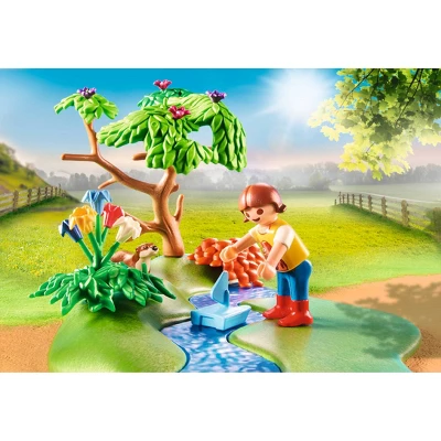 The weather is great for an Adventure Pony Ride. The guide leads the young rider and pony on the trail to explore nature. As they follow the path, they see ducks, a frog, butterflies and beautiful flowers. With a helmet for added protection, the child can safely ride astride the pony. Play with this set on its own or combine it with the rest of the PLAYMOBIL Pony Farm world (#70510-70516, 70682-70683, 70518-70523 – each sold separately) for even more fun. Set includes one adult figure, one child figure, two ponies, foal, butterflies, ducks, ducklings, tree with stream, fencing, trail signs, and many other accessories. Recommended for ages four to ten years.