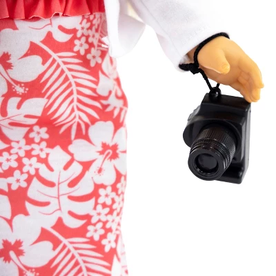 The Travel Time pack from Playtime By Eimmie is your one-stop-shop for all things travel. Dressed for a tropical adventure, just imagine the fun that awaits your child and their 18″ doll in paradise. Not only can your little one dress up her doll, but she can also match with her. The adventure doesn’t have to stop there though, imagine all the places they can go with the world at their fingertips! Over or under packed, its always so hard to tell but, either way their doll will be prepared. The adorable set is loaded with accessories to make every trip and adventure. This 14 piece set includes: Travel suitcase with working wheels, a tropical print dress and matching headband, white sweater, brown faux leather sandals, white sunglasses, camera, neck pillow, a plane ticket, passport, adventure journal, tour brochure and a matching tropical print headband for your child! Also included is a color and mail post card activity allowing your child to share with someone special, the fun they’re having while playing with this adorable set from Playtime by Eimmie.