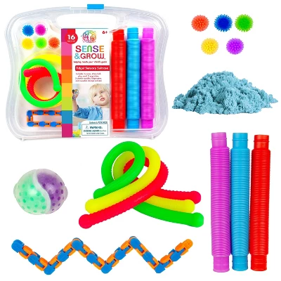 - Explore the sense of touch with squishy poms, water bead stress ball, play sand, pop tubes, stretch noodles, and other fidget gear