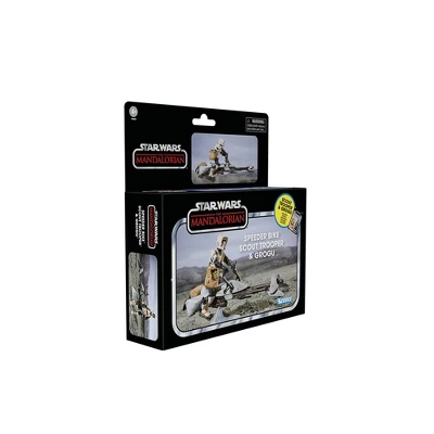 Celebrate the legacy of Star Wars with premium 3.75-inch scale vehicles, playsets, and action figures for adults and kids alike from Star Wars The Vintage Collection. (Additional products each sold separately. Subject to availability.) Inspired by The Mandalorian, this Star Wars The Vintage Collection 3.75-inch-scale Speeder Bike, Scout Trooper & Grogu figure makes a great gift for Star Wars fans and collectors.