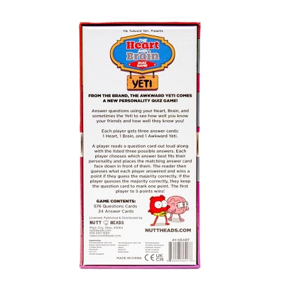 Each player begins by taking 3 Answer Cards, 1 Heart, 1 Brain, and 1 Yeti. A player reads a Question Card and the 3 possible answers out loud. The other players decide which answer best fits them and places their coordinating Answer Card face down.