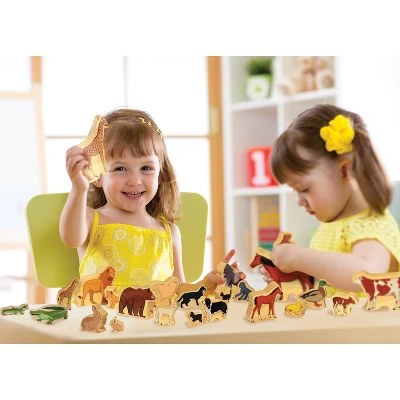 - This wooden block set includes 24 animal-themed pieces with double-sided illustrations