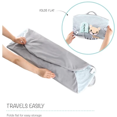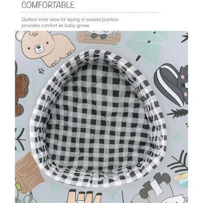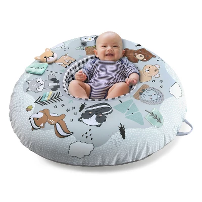 Your little one will dream of playing in the rivers and forest with The Peanutshell Woodland Baby Play Ring. Printed microfiber fabric features an adorably illustrated woodland scene, including forest friends, mountains, and trees. Ring cover is dimensional and interactive, with appliques, ribbons, 3D owl wings, deer head, porcupine body, trees, and a squeaker! This inflatable play ring is easy to use, simply semi-inflate, gently pulling the sides of apart, and place inside the cover to finish inflating. Baby will fit in a comfortable nest with quilted center, while being able to play with the interactive elements of the ring. Note that for babies not yet able to sit, the back and neck should be only partially inflated, with baby’s back and neck as flat as possible; babies able to sit can use the fully inflated ring. When finished, simply deflate the ring and fold the cover up for easy storage. Interactive elements encourages development of motor skills, and enhances your child’s imagination and sensory skills. Have fun with your little one, while they learn and play in this self-contained play space!