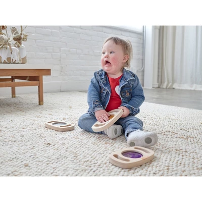 TickiT Easy Hold Glitter Panels for Sensory Play, Set of 3 | This glitter panel set comes with three glitter panels in three different colors. Stimulate the senses with gold, silver and purple glitter! Children will love the bright colors and smooth surfaces. Small hands will have no problem gripping the large handholds with rounded edges. Hold the panels up to a sunlit window or a light panel to watch the sparkling colors dance. These durable Rubber wood and acrylic panels are designed to last for years without scratching, leaking or breaking. | Size: Frame: 7.3″L x 4.8″W x .8″H (glitter panel 3.1″ dia).