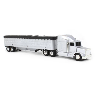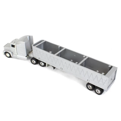 Made by ERTL, this 1/64 scale semi grain truck features a removable tarp, opening trailer doors, and foldable landing gear. It is constructed from diecast metal with some plastic parts and rubber wheels. Per the manufacturer, it has a recommended age of 8+ years. The item is sold “loose” without any original packaging.