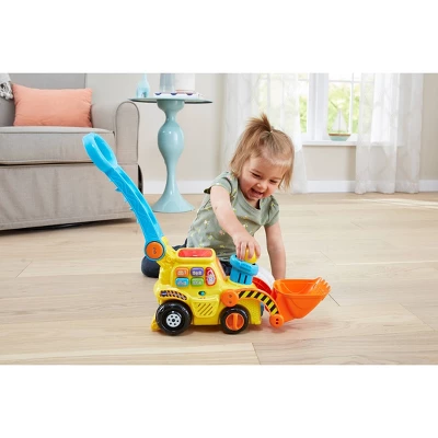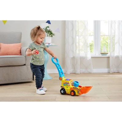 Pop, drop and watch your child stroll along with the Pop-a-Balls™ Push & Pop Bulldozer™ by VTech®! This delightful bulldozer encourages movement and motor skills in your little builder when the colorful balls pop up through the smoke stack, into the scoop bucket and back again. Load the balls into the bulldozer, start pushing the handle and watch the bulldozer come to life with poppin’ balls and fun sounds! Your kid can also sit and play with the bulldozer by pressing the four colorful number buttons to learn colors, numbers, construction objects and listen to music.